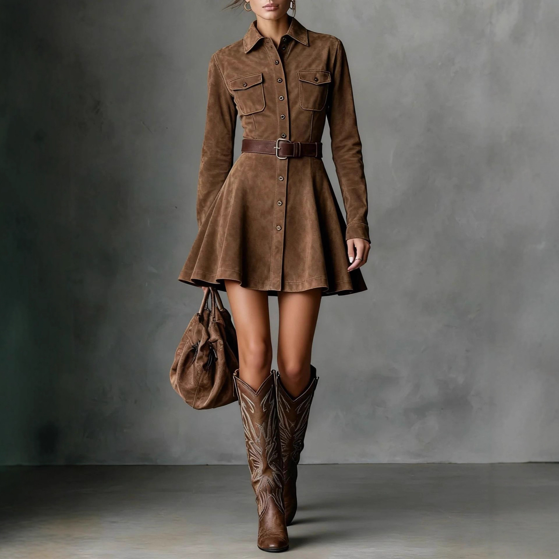 Elegant Graceful Solid Color Long Sleeve Pocket Waist Dress Slimming Without a belt